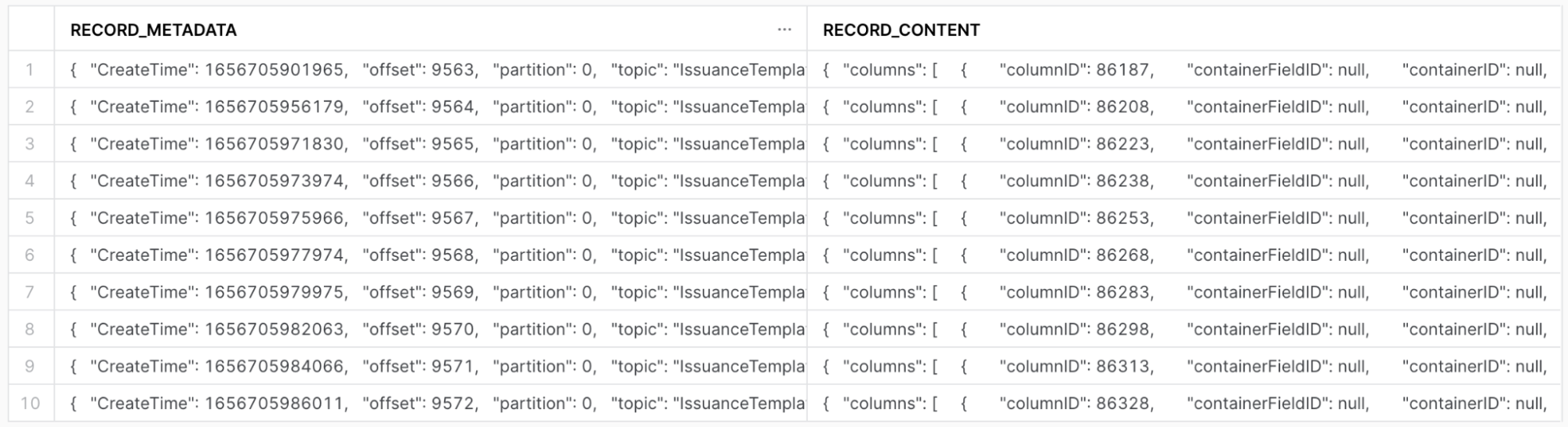 The Snowflake Connector creates a new table for every Kafka topic and adds a new row for every event. In each row there’s a record_metadata column and a record_content column. Each column is a variant type in Snowflake.